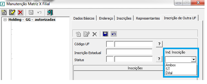 Acessar o Menu: Gerencia > Parâmetros Empresa > Empresa Filial > Inscrição de Outra UF
