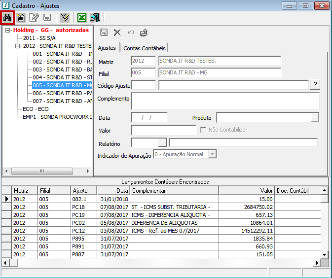 Melhoria na pesquisa dos ajustes para otimização de performance com inclusão do botão 'Pesquisar Ajuste' na tela. Para que os lançamentos contábeis sejam apresentados, o usuário deverá selecionar a Matriz/Filial e em seguida clicar neste novo botão. Esta pesquisa irá trazer as últimas 500 linhas lançadas. Segue ilustração abaixo: