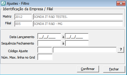 Caso o usuário desejar, poderá ser realizada uma pesquisa mais refinada através do botão 'Filtrar'. Clicando nele uma tela é habilitada onde se pode pesquisar por data de lançamento, sequência de fechamento e código do ajuste. Segue ilustração abaixo:
