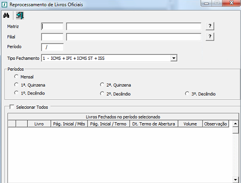 Obs: Somente Livros Fiscais com configuração de Termos de Abertura e Encerramento podem ser reprocessados.