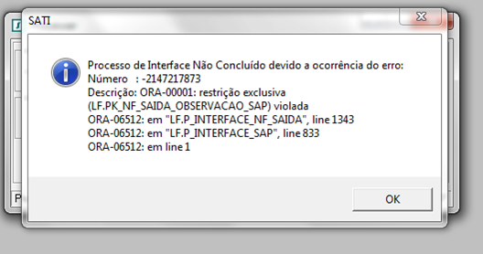 Descrição da Nota: Correção realizada na Interface de Indiretos (Processar Dados) referente ao dump: ORA-00001: restrição exclusiva (LF.PK_NF_SAIDA_OBSERVACAO_SAP) violada.