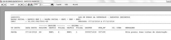 Correção realizada na Interface de Indiretos (Processar Dados), para quando ocorrer este cenário, a Nota Fiscal seja exibida no Relatório de Log de Erros com a seguinte informação: