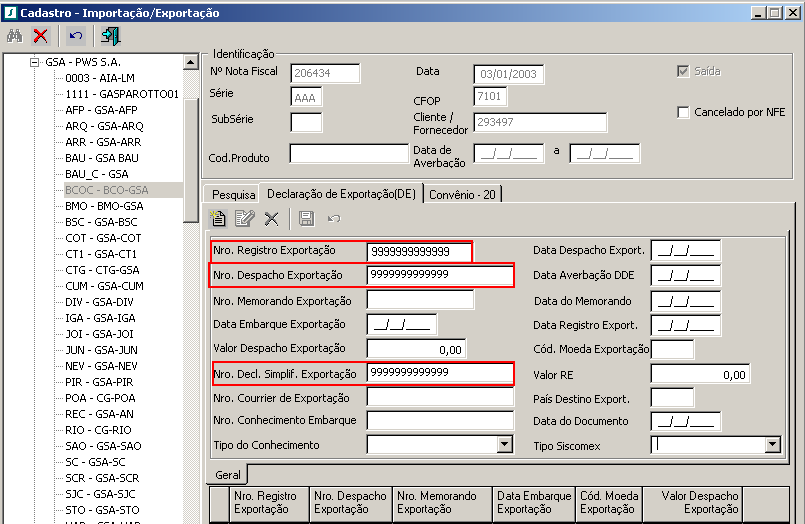 Informações necessárias da tela Cadastro-Importação/Exportação
