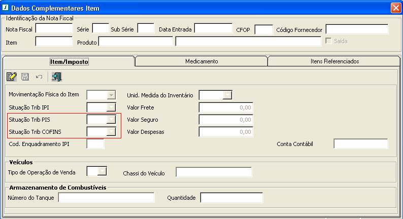 Realizada alteração para habilitar os campos Situação Trib Pis e Situação Trib Cofins da aba Item/Imposto da tela Dados Complementares Item, para os impostos A2 - PIS AUTOPECAS e A3 - COFINS AUTOPECAS.