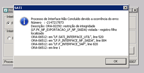 ORA-02292: restrição de integridade (LF.FK_NF_EXPORTACAO_LF_NF_SAIDA).
