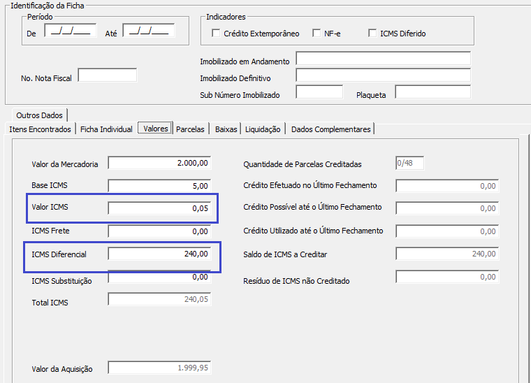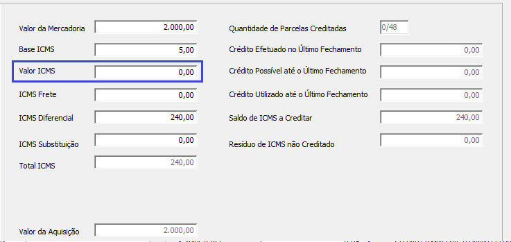 Tratamento realizado para o cenário de importação e quando a ficha tiver explosão de quantidade, o campo Valor de ICMS seja igual a 0,00, quando o valor não atingir o mínimo da parcela.
