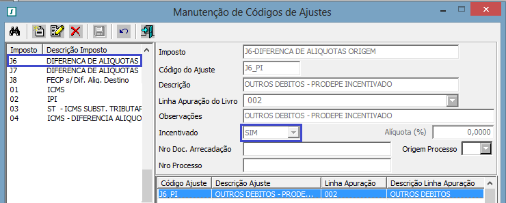 Os códigos de ajuste criados manualmente para a apuração incentivada deverão conter SIM para o campo " Incentivado".