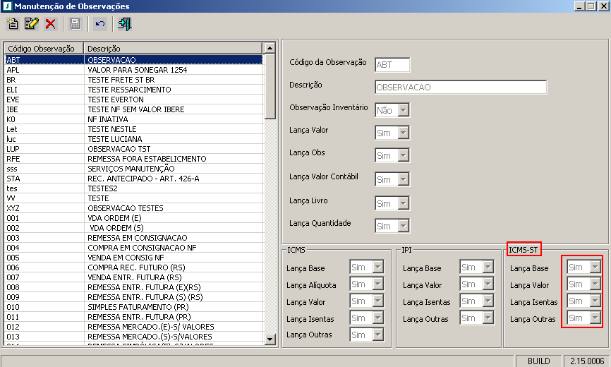 Os dados na tela de Manutenção de Observações sobre ICMS-ST terão como default SIM.