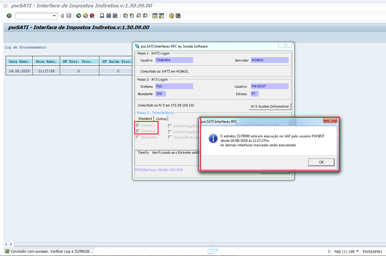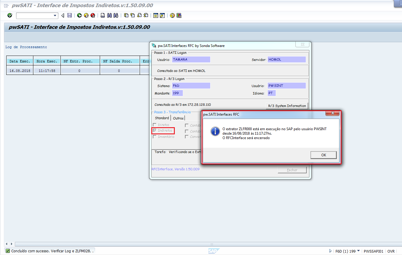 ‘O extrator ZLFR000 está em execução no SAP pelo usuário 'XXX' (usuário SAP) desde (data e horário). O RFCInterface será encerrado.’