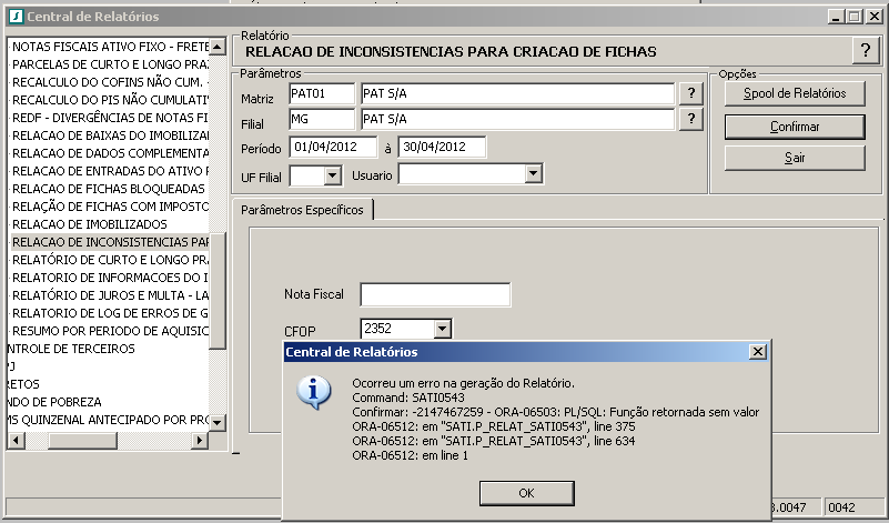 Ocorre o seguinte erro ao solicitar o relatório Relação de Inconsistência para Criação de Fichas: