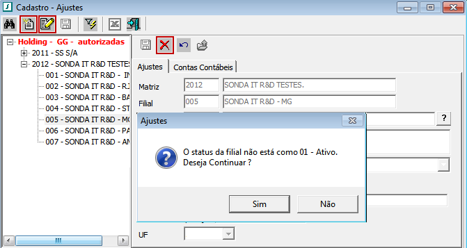 Melhoria em tela para que a mensagem “O status da filial não está como 01 – Ativo. Deseja continuar?” ocorra somente após o usuário executar alguma das seguintes ações destacadas abaixo: