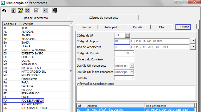 Cadastrar o vencimento para o imposto J8 para a UF de Destino, na aba Filial ou Estado.