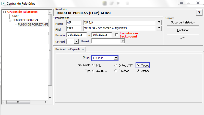 Antes de efetuar o Encerramento de Indiretos, gerar o relatório do Fundo de Pobreza da Filial. No exemplo selecionamos o Grupo FECPSP.