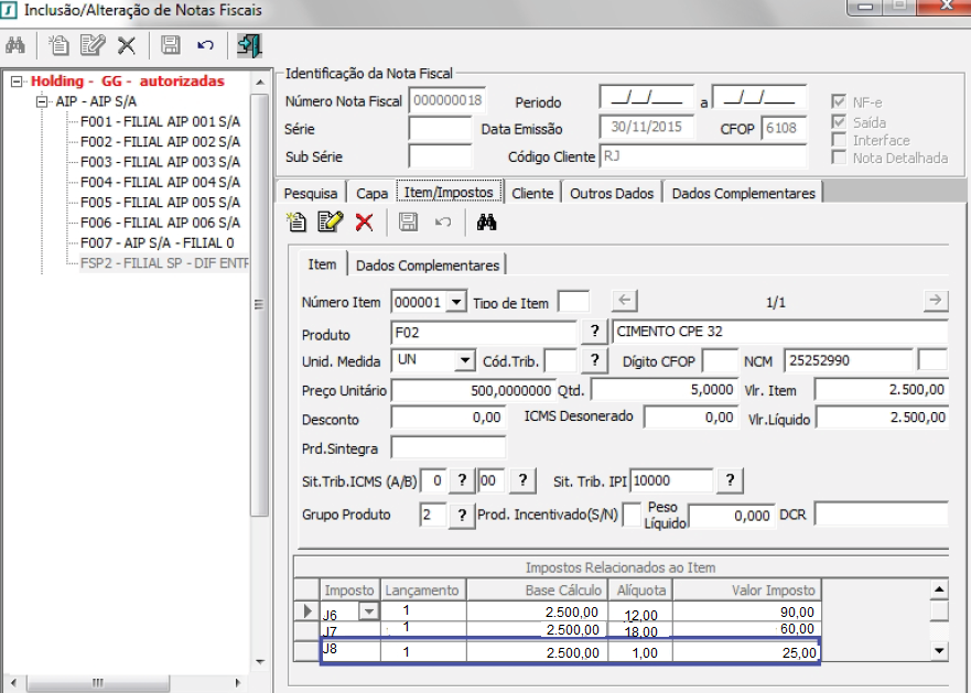 Abas CFOP, Imposto e UF: Preenchimento obrigatório;