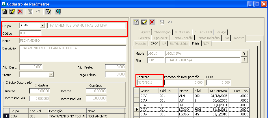 Por apresentar incompatibilidade entre algumas versões do oracle, havia erro relacionado à data de vigência do contrato (menu Relatórios > Cadastro de Parâmetros > Grupo CIAP > codrel 001 > aba filiais > campo Contrato):