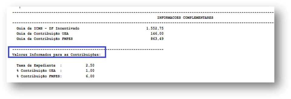 Se houver a parametrização dos parâmetros de contribuições de UEA/FMPES e taxa de Expediente, após o fechamento será impresso os Valores informados para as Contribuições.