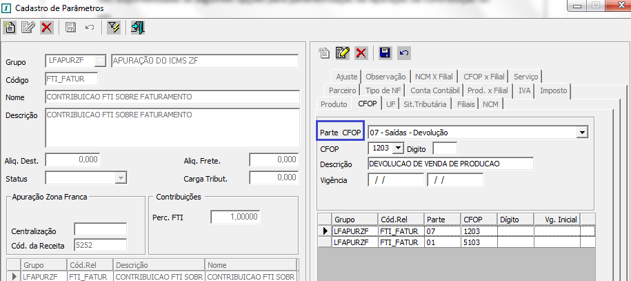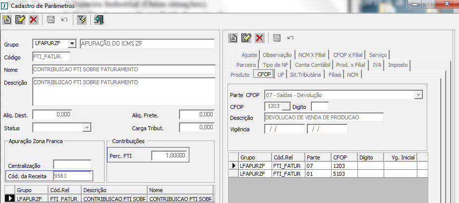 Cabeçalho: ZFM – Apuração FTI Faturamento