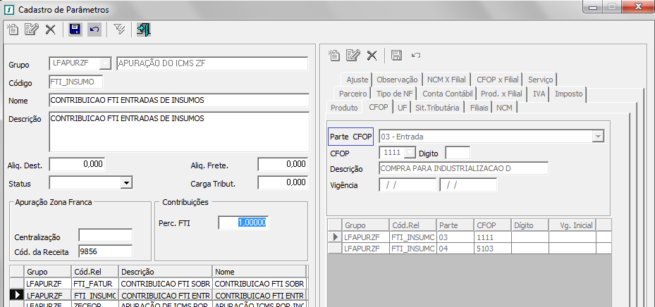 Contribuição FTI: resultado do Faturamento Liquido multiplicado pelo percentual parametrizado no campo PERC. FTI do Grupo LFAPURZF (Cód. FTI_INSUMO).