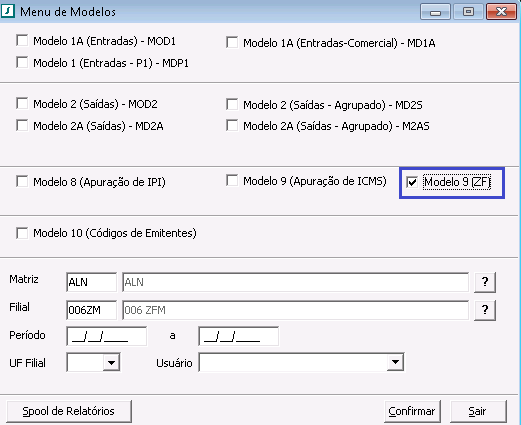 Após informar a Matriz e Filial, será demonstrado o Modelo 9 (ZF).