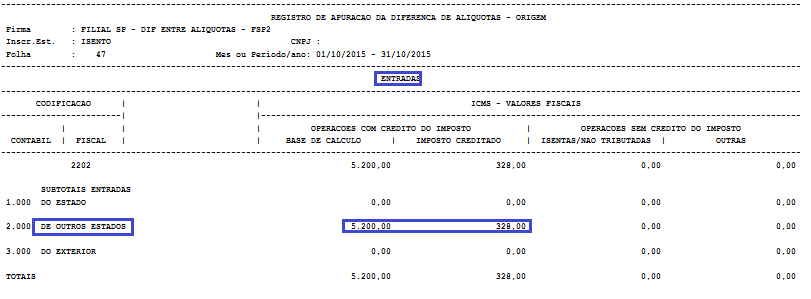 Por se tratar de uma operação interestadual, só conterá movimento para o quadro “De outros Estados”. Serão apresentados dados de Base de Cálculo de Imposto.