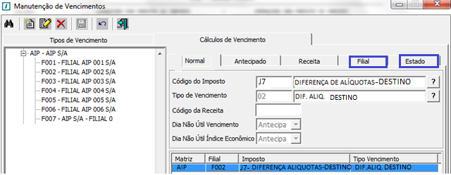 A parametrização do vencimento de cada UF deverá ser feita nas abas “Filial” ou “Estado”. Vide exemplo parametrizado na aba "Filial":