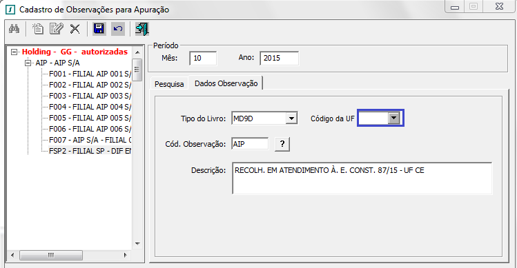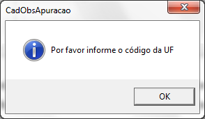 Para este código será habilitado o filtro “UF”, que, cujo preenchimento é obrigatório. Se o filtro “UF” não for preenchido, a observação não será gravada.