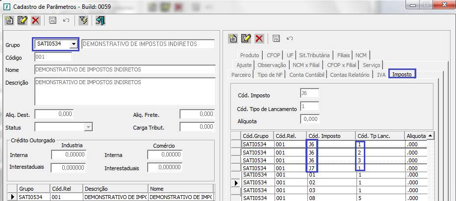 Para que os impostos J6 e J7 sejam considerados pelo relatório, efetuar a seguinte parametrização: