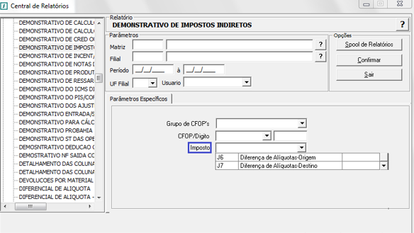 Para conciliação de valores dos impostos J6 e J7, sugerimos utilizar o relatório já existente “Demonstrativo dos Impostos Indiretos (SATI0534)”.