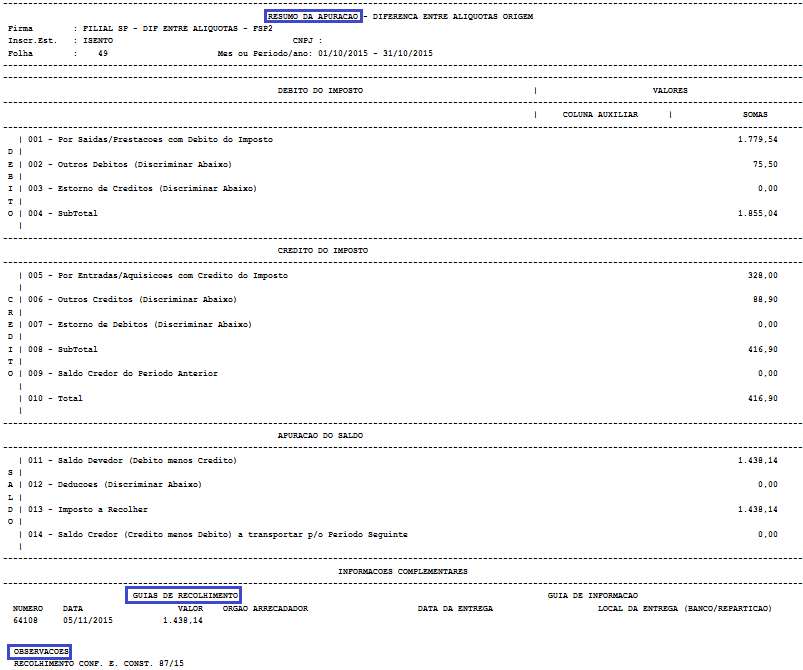 Saldo devedor: O valor será demonstrado nas linha 011 (Saldo Devedor) e 013 (Imposto a Recolher).