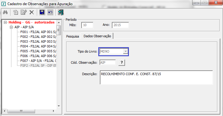 Para lançamento de observação da apuração acessar o menu: Cadastro > Observação Apuração. Informar o período (mês e ano).