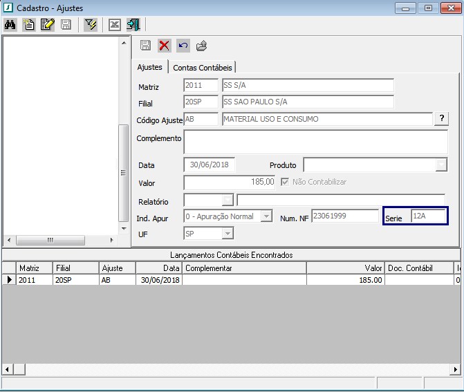 Inclusão do campo "Serie" na tela de Cadastro - Ajustes para visualização quando houver ajuste específico de uma nota fiscal.