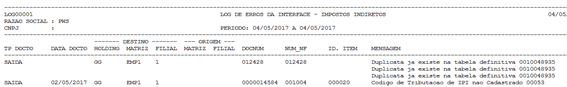 Correção realizada na Interface de Indiretos (Processar Dados), para quando ocorrer este cenário, a Nota Fiscal seja exibida no Relatório de Log de Erros.