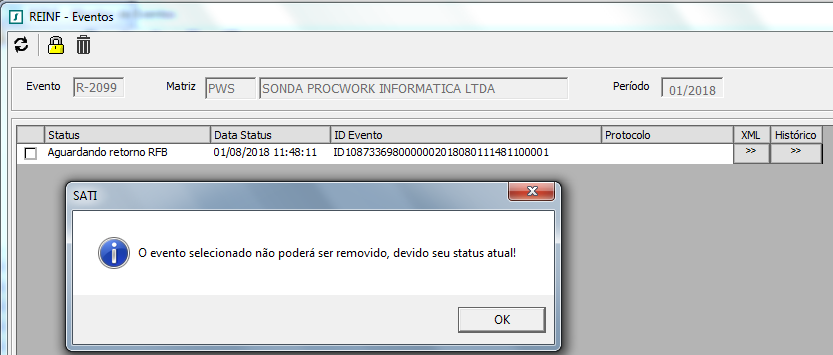Tratamento efetuado para não permitir remover eventos com status Aguardando Retorno RFB. Ao tentar remover um evento com esse status será apresentada a mensagem abaixo.