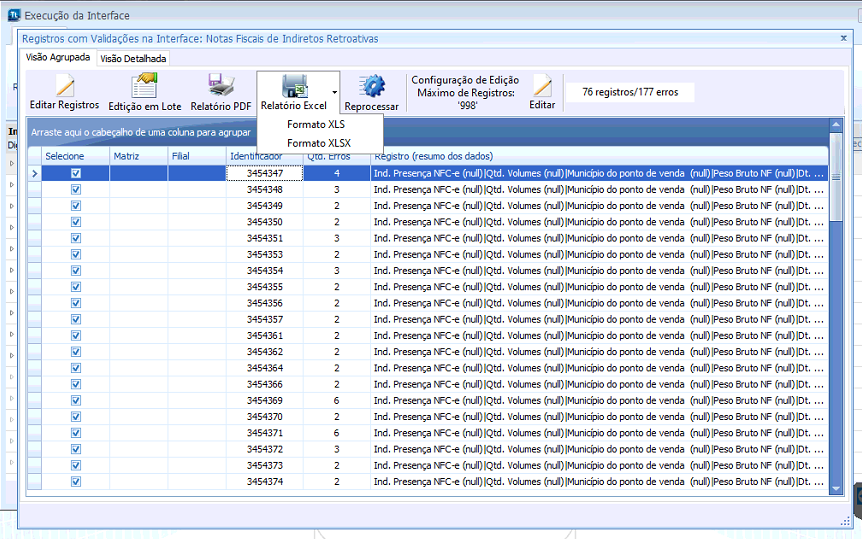 Foi implementada a funcionalidade de geração de relatório de erros de Validação das Interfaces em planilha Excel, com a extensão .xlsx. Essa melhoria foi proposta, pois já existe essa possibilidade de geração de planilhas com extensão .xlsx, na aba Visão Detalhada.