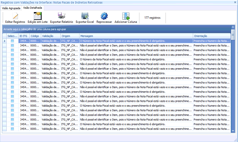 Em conjunto, também está sendo liberada a padronização de colunas/campos da tela de Validação da Interface, das abas de Visão Agrupada e da Visão Detalhada.