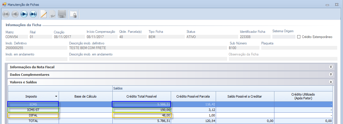 Nos demais campos, será considerada a informação do campo "Crédito Total Possível" da aba "Valores e Saldos" da tela "Manutenção de Fichas". Assim, no campo:
