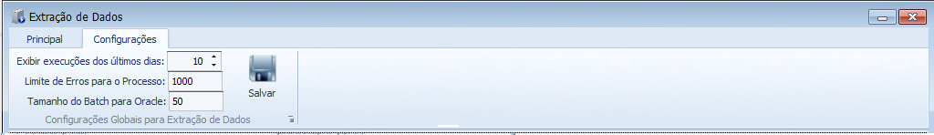 - Os parâmetros referentes ao Limite de Erros do Processo e tamanho de Batch para banco de Dados Oracle foram Incluídos na Aba de Configurações da Tela de Execução de Extração, permitindo que o usuário controle estes parâmetros.