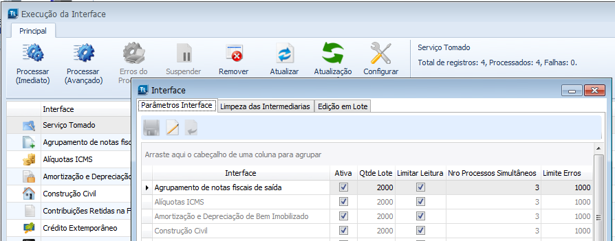 - A parametrização do Limite Erros de foi alterada sendo agora definida por interface, o valor inicial para todas interfaces será de 1000 erros caso o usuário queria poderá alterar este valor através da Tela de Configurações de Interface.