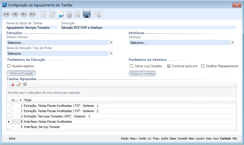 Na tela de Configuração de Agrupamento de Tarefas, deverão ser informados os parâmetros de execução para cada tarefa (Extração ou Interface) conforme realizado na tela Especifica de cada tipo de Tarefa, a Ordem de Execução poderá ser alterada conforme necessidade do usuário, para execuções simultâneas basta informar no campo: ”Ordem” números iguais para os processos.