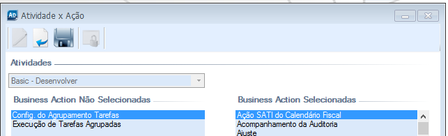 Nas telas "Atividade x Ação" e "Atividade X Transação".