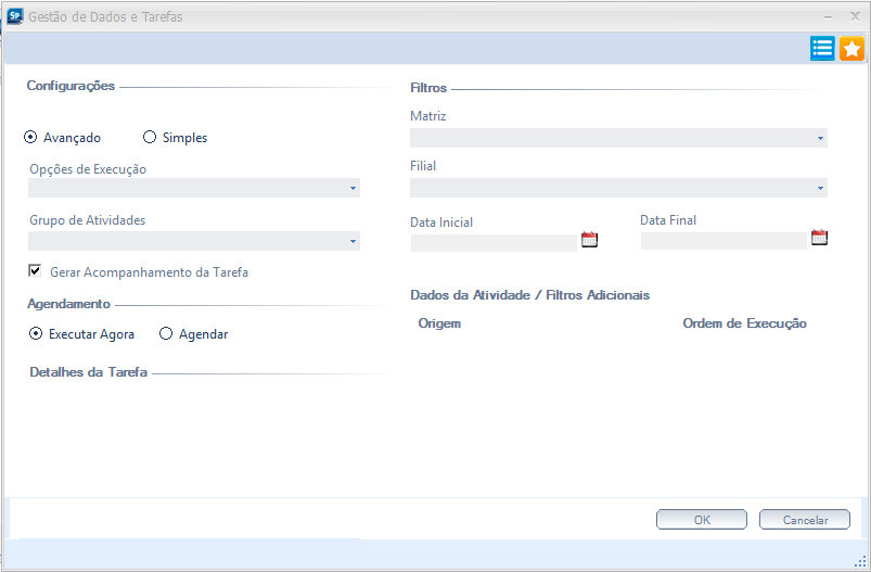 Incluída a opção ‘Gerar Acompanhamento da Tarefa’ na tela de Gestão de Dados e Tarefas, que por padrão estará selecionada na abertura da tela: