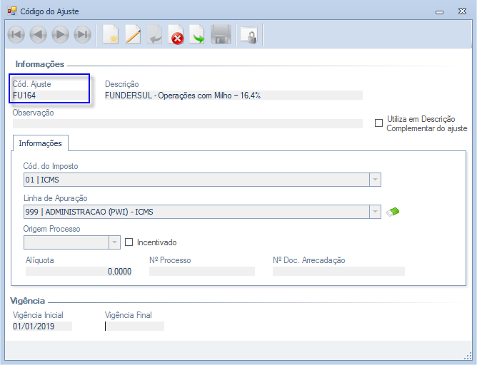 No exemplo acima, este parâmetro foi preenchido com o Código do Ajuste FU164. A associação deste Código do Ajuste com o Código de Ajuste da SEFAZ foi devidamente realizada na tela "Associação de Ajustes", conforme ilustrado abaixo: