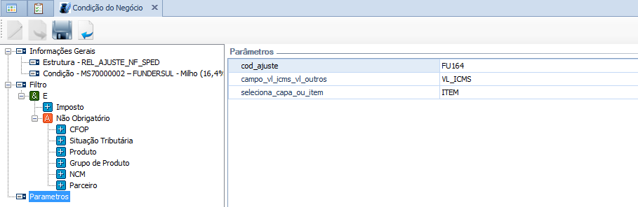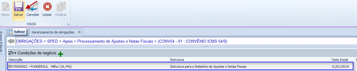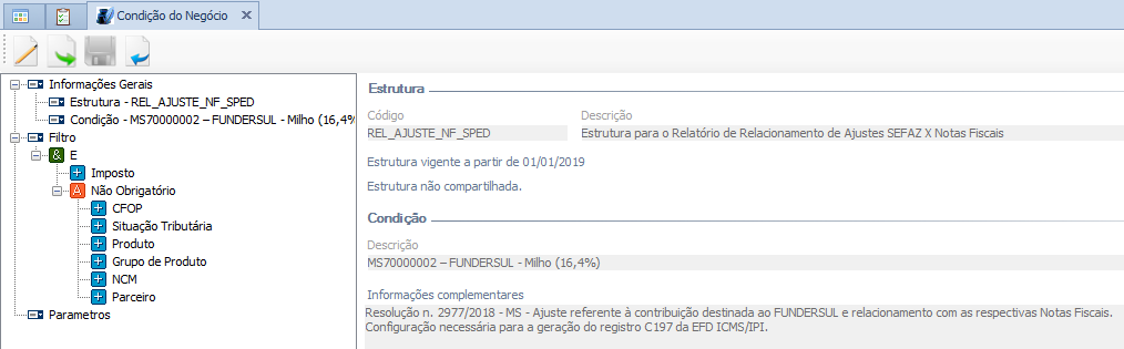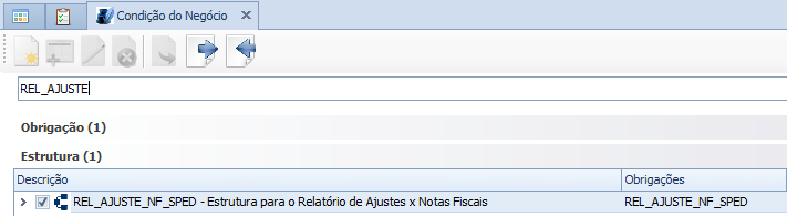 Foi disponibilizada a obrigação REL_AJUSTE_NF_SPED para que seja vinculada a Condição de Negócio, conforme demonstrado abaixo: