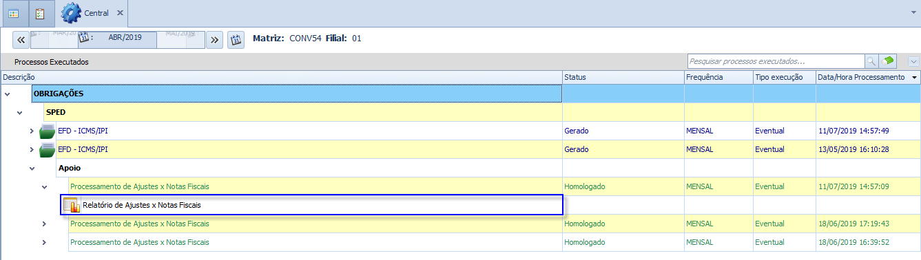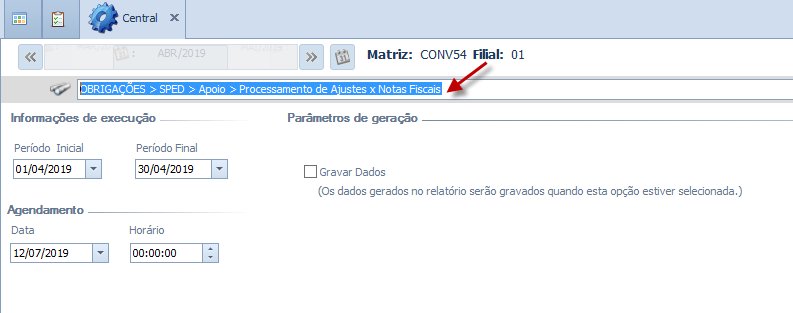 O Relatório de Ajustes x Notas Fiscais foi disponibilizado na Central. Para executá-lo, seguir a hierarquia: OBRIGAÇÕES -> SPED -> Apoio -> Processamento de Ajustes x Notas Fiscais.
