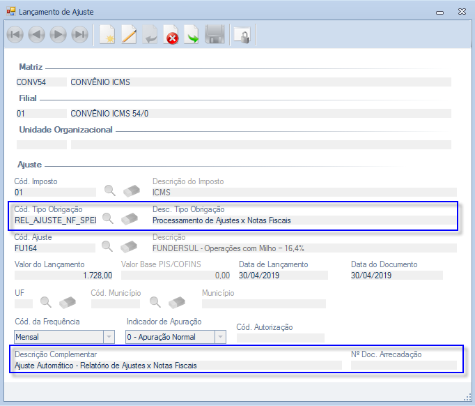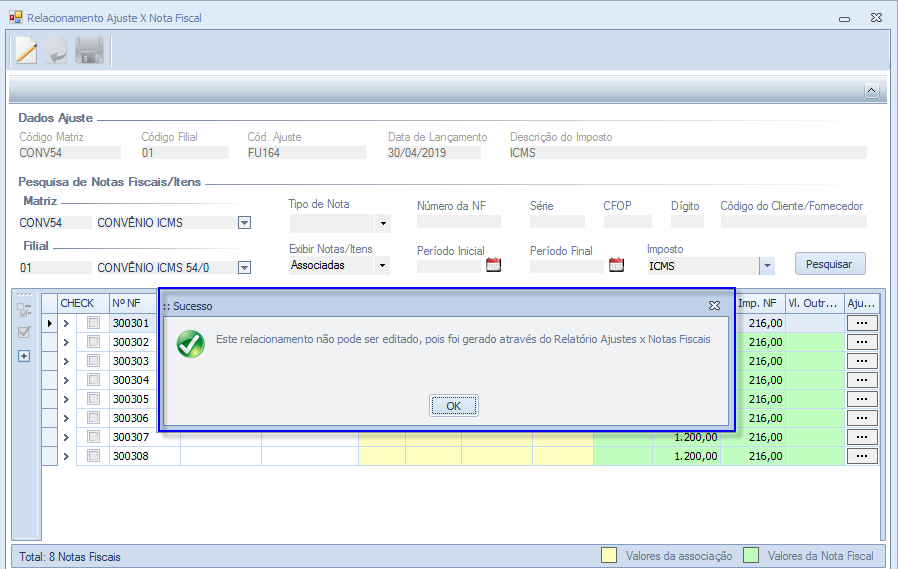 Porém, o relacionamento do Ajuste com as Notas Fiscais não poderá ser editado.