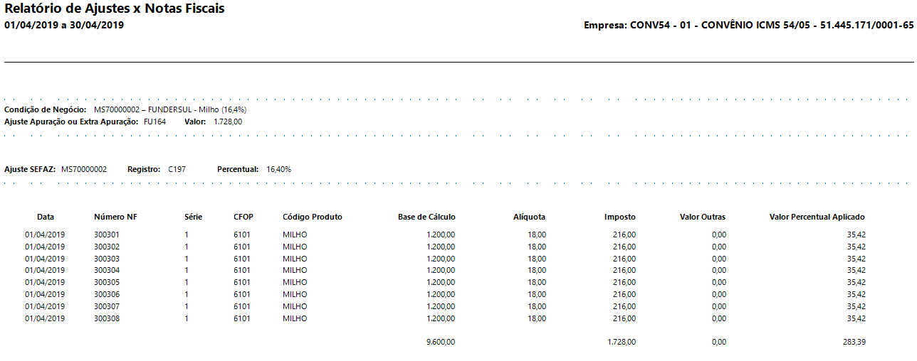 Conforme ilustrado acima, o subtítulo deste relatório é composto pelas seguintes informações: Condição de Negócio, Ajuste da Apuração ou Extra Apuração, Valor do Ajuste, Ajuste da SEFAZ, Registro e Percentual.