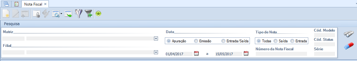 Possibilidade de pesquisa por diferentes tipos de data: Data de Apuração, Emissão ou Entrada/Saída. Outros campos podem ser utilizados como Tipo de Nota, Número da Nota Fiscal, Cód. Modelo, Cód. Status e Série, estes não são obrigatórios.