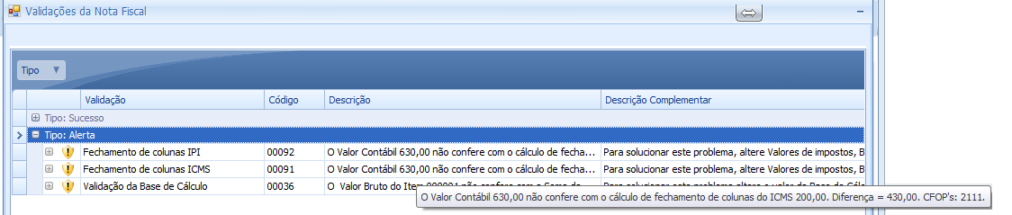 2 - Tratamento nas validações 91 - Fechamento de colunas ICMS e 92 - Fechamento de colunas IPI, para que sejam apresentados os CFOPs dos itens que fazem parte do cálculo realizado. Elas são apresentadas ao gravar a Nota Fiscal na tela, caso apresente inconsistências.
