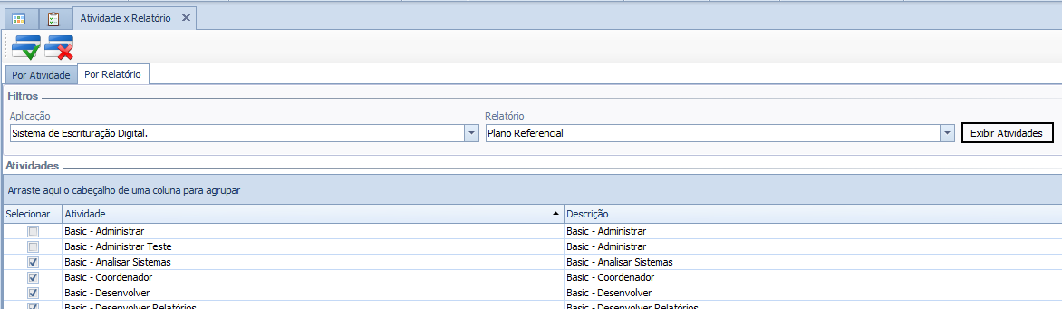 Para a geração, é necessário autorizar o acesso na tela Atividade X Relatório.