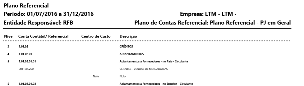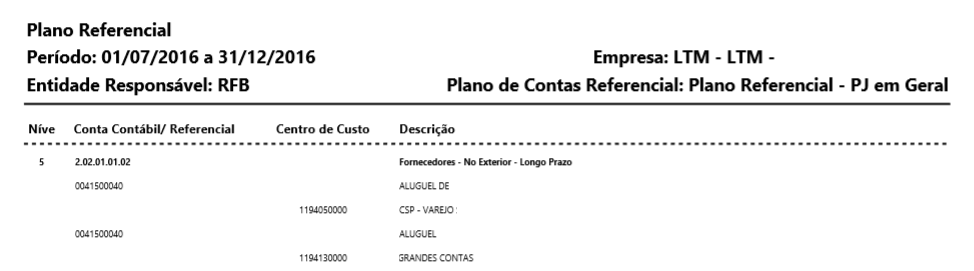 Na primeira parte do relatório será demonstrado o plano de contas referencial por ordem de conta, quando há contas/centros associados são demonstrados abaixo da conta que foi relacionada: